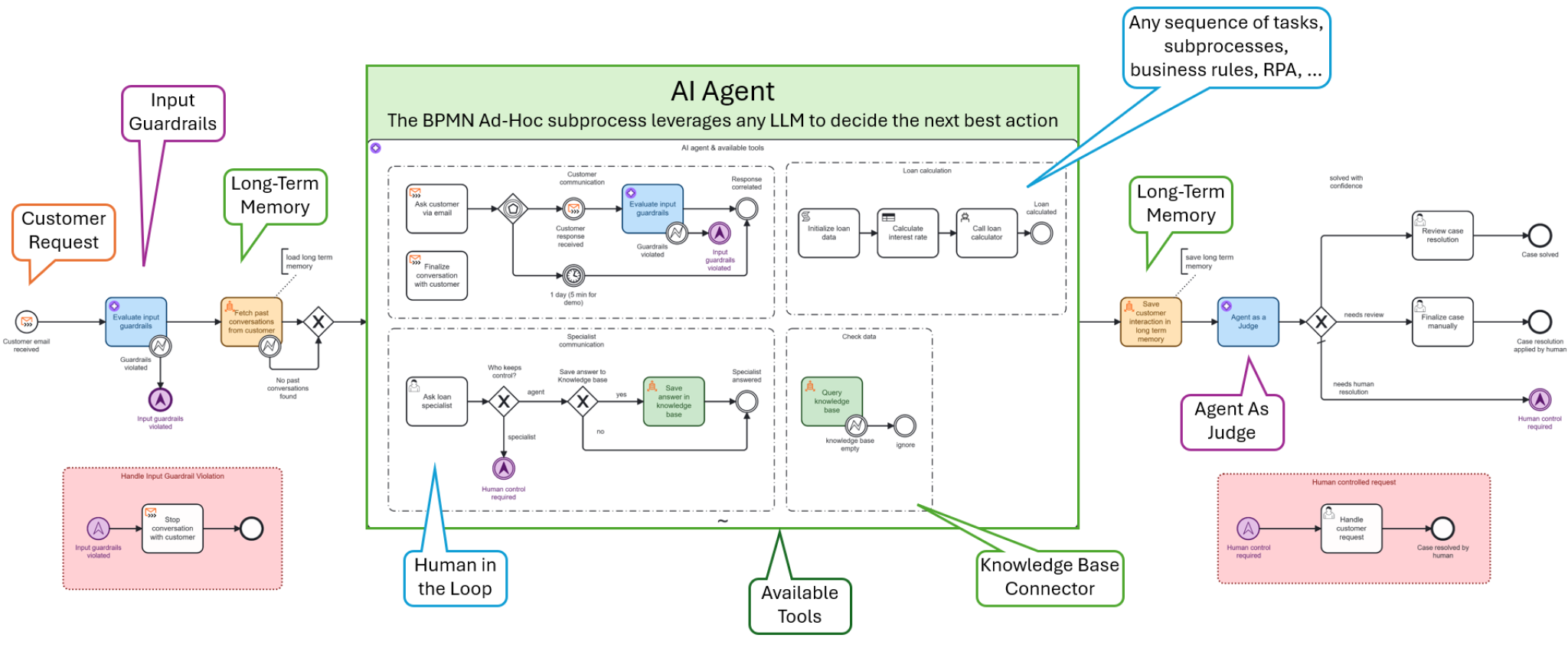 Das Charmante an dieser Lösung ist, dass wir nun jegliche Art von bekannten strukturierten Prozessen – sogar langlaufende Anteile – als Tool zur Verfügung haben. Strukturierte Business-Regeln gefällig? DMN steht gerne bereit. Altsysteme anbinden? Wie wäre es mit RPA? Konversationen mit Korrelation? Standard-Pattern. Human-In-The Loop? Bei Prozessdigitalisierung immer schon enthalten. BPMN Superpowers gefällig? Eskalation etc. helfen beim gesteuerten Verlassen der KI-Schleife.